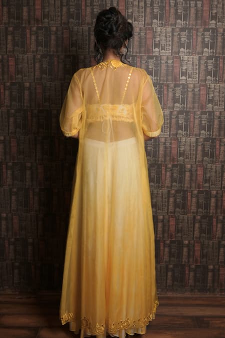 Yellow longline sheer jacket with resham & mirror work border. Paired with embroidered blouse & tie & dyed palazzo.