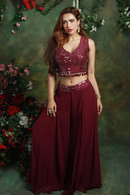 Light purple longline jacket with mirror work embroidery. Paired with burgundy blouse embroidered with mirror & resham work & georgette palazzo.