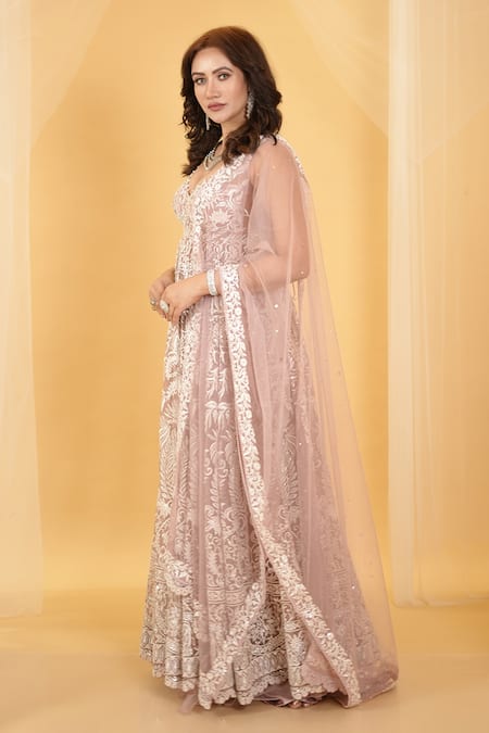 Pink anarkali featuring a leaf neck design with flared silhouette and padded bodice. Paired with a net dupatta adorned with embroidered borders.