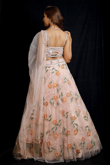 Pink Net Cutdana, Resham, Sequins Sweetheart Neck Floral Embroidered Lehenga Set