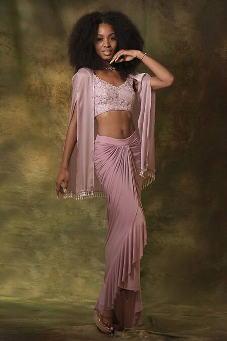 Purple embroidered blouse featuring a V-neck and sleeveless design. Paired with a pastel lilac jacket with cape sleeves and a draped dhoti skirt with a frilled hem detail.