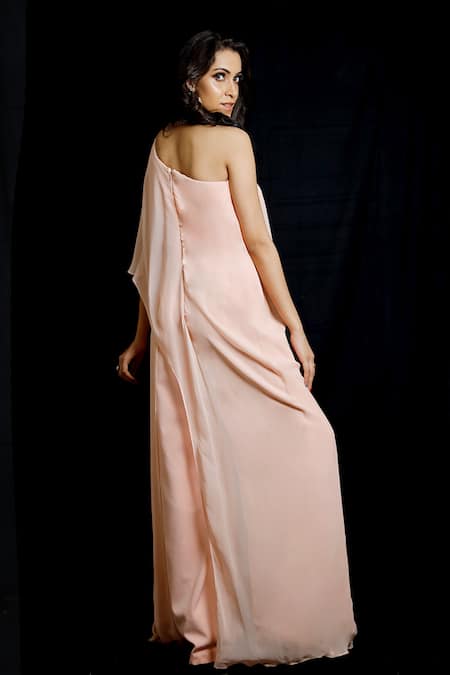 Pink one shoulder jumpsuit with floral motif prints, highlighted with cutdana, Kasab thread work.