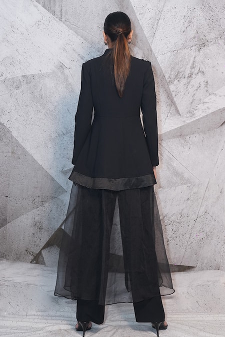 Black blazer featuring 3D paisley embroidery with thread work, stones, and beads on the shoulder, complemented by a back trail. Paired with matching pants for a complete look.