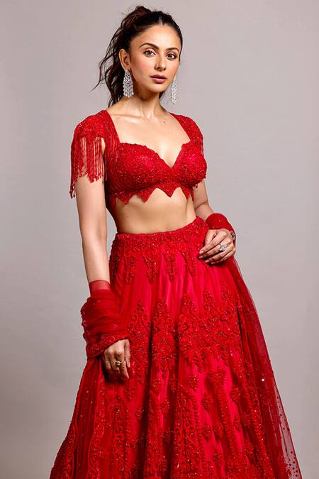 Frilled hem on lehenga, All-over embroidery with resham and sequins, Cutwork lace border on dupatta