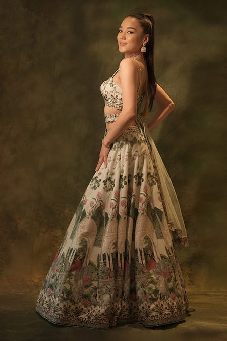 Cut-out dupatta border, Padded blouse with back drawstring, Floral and scenic motifs with qasab embroidery