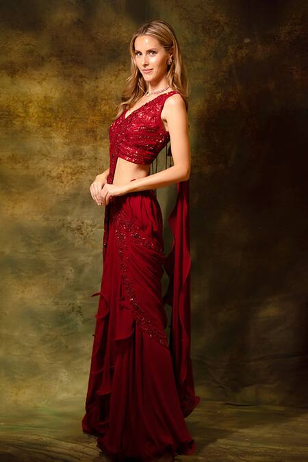 Red pre-draped saree adorned with sequins, bead, and stone embroidery featuring side ruffles. Paired with a matching padded blouse embellished with sequins.