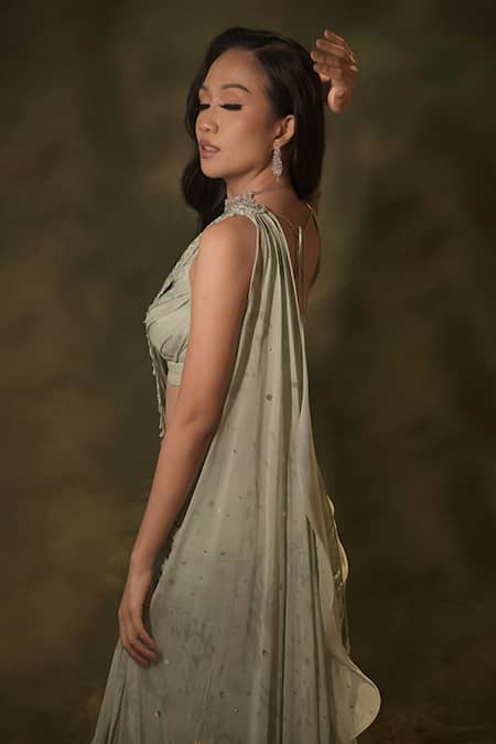 Green pre-draped saree featuring tonal floral blossom patterns highlighted by 3-D sequin, stone, bead embroidery and ruffle detailing. Paired with a pleated padded blouse with back drawstring detail.