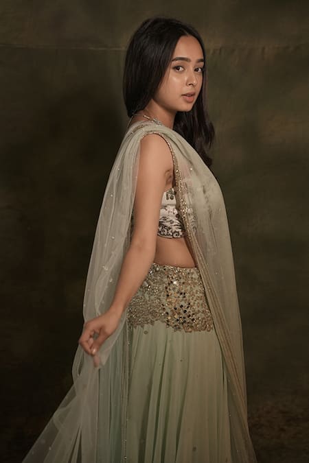 Green Georgette, Net Mirrors, Sequins, Mirrorwork Embellished Lehenga Set