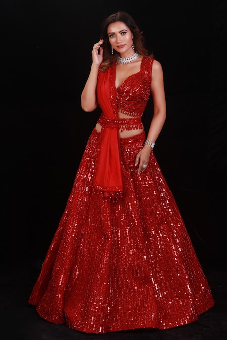 Red lehenga with sequins & bead work embroidery all-over. Paired with embroidered blouse with tassel hem & dupatta.