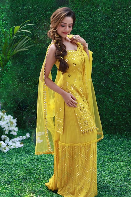Yellow kurta with resham & mirror work embroidery. Paired with embroidered sharara & sheer dupatta.