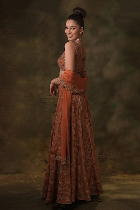 Rust georgette lehenga featuring zardosi and thread hand embroidery. Paired with a dupion silk padded blouse and a dupatta.
