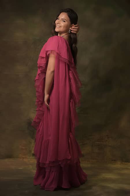 Pink ruffle pre-draped saree featuring zardozi embroidered floral patterns and a tiered hem. Accompanied by a matching padded blouse.