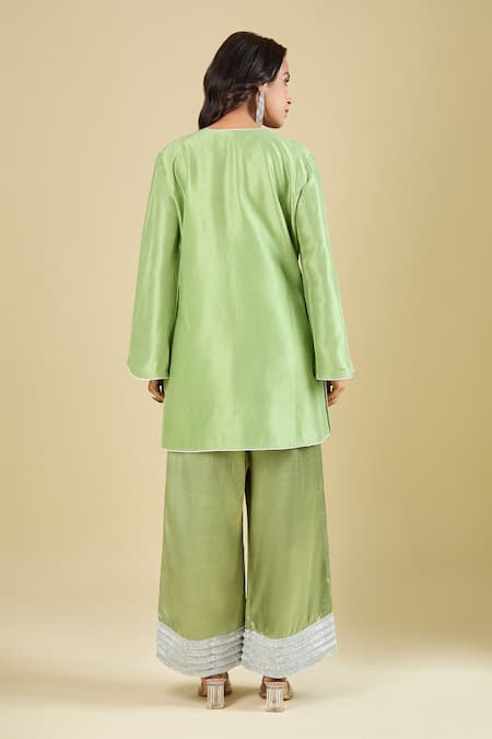 Green butta embroidered kurta featuring a relaxed fit and a round neckline. Paired with matching palazzo and a coordinating dupatta.