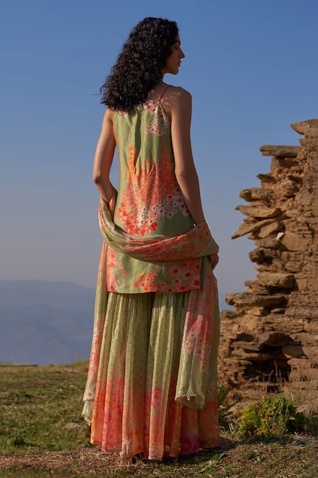 Multi color kurta featuring a sweetheart neckline and sleeveless design in bamberg silk with all-over gardenia print and multi-tonal sequins highlights. Paired with a matching flared sharara and a printed dupatta.