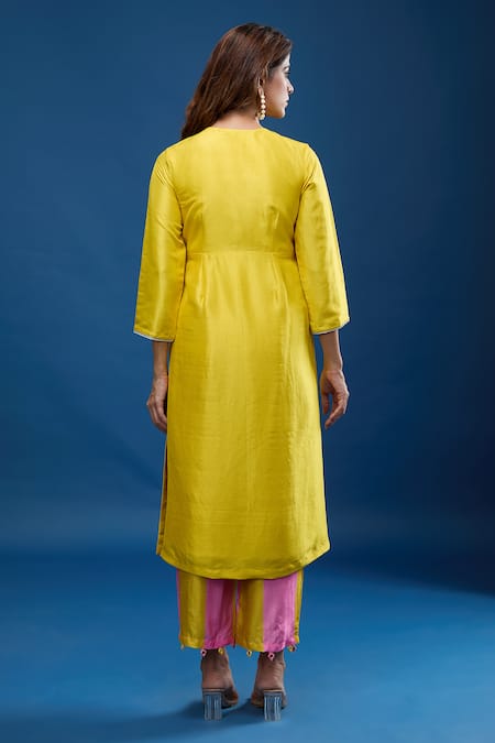 Yellow silk kurta featuring embroidered yoke and 3/4 sleeves. Paired with striped pant in yellow and pink hues.