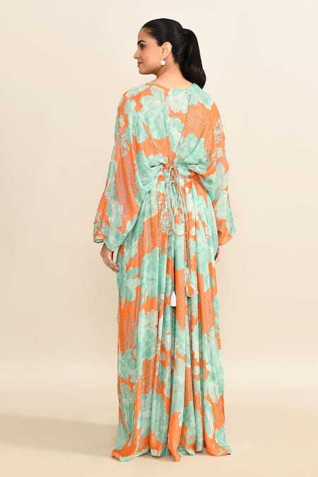 Blue and orange kaftan featuring floral print with sequin and bead embroidered waist. Paired with a solid blue inner slip.