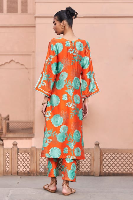 Orange Bamboo Beads, Embroidery Round Neck Floral Jaal Print Kurta And Pant Set