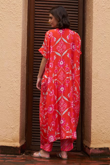 Orange kurta featuring floral print with zardozi, sequin, and pearl embroidery. Paired with matching pants for a complete look.