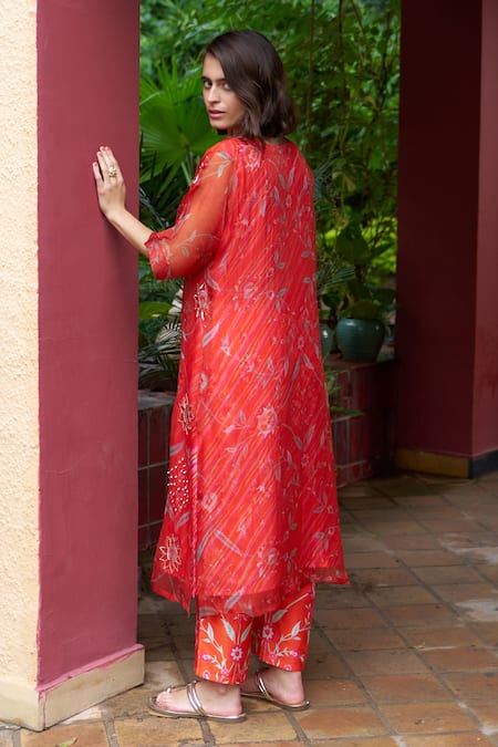 Orange kurta featuring a V neck, kaftan sleeves, and geometric print with sequin and pearl embellishments. Paired with coordinating printed pant.