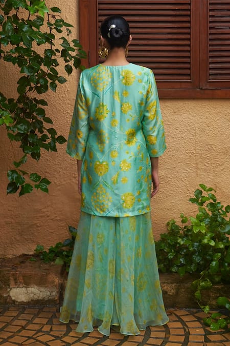 Buy_Archana Shah_Blue , Satin Pearls, Paisley Print And Embroidered Kurta & Sharara Set _Online_at_Aza_Fashions