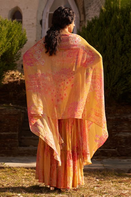 Yellow cape featuring batwing sleeves in shimmer georgette with an all-over primrose bloom print. Paired with a sleeveless tonal sequins encrusted blouse and a printed tiered sharara.