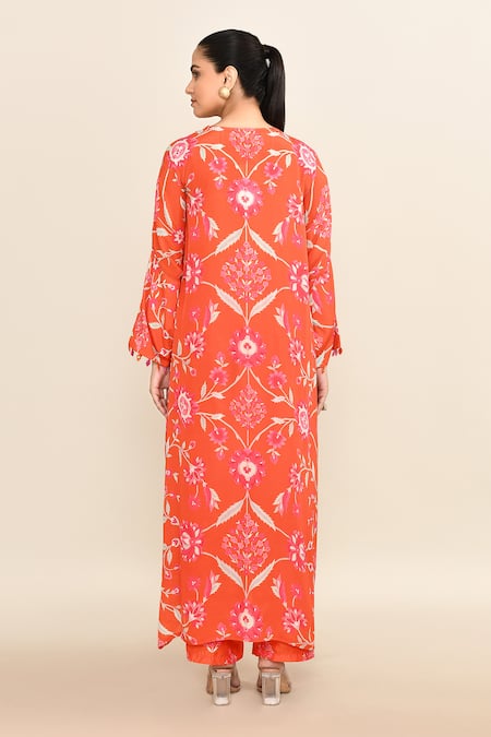 Orange kaftan featuring floral bloom prints with embroidered yoke. Paired with coordinating floral print pant.