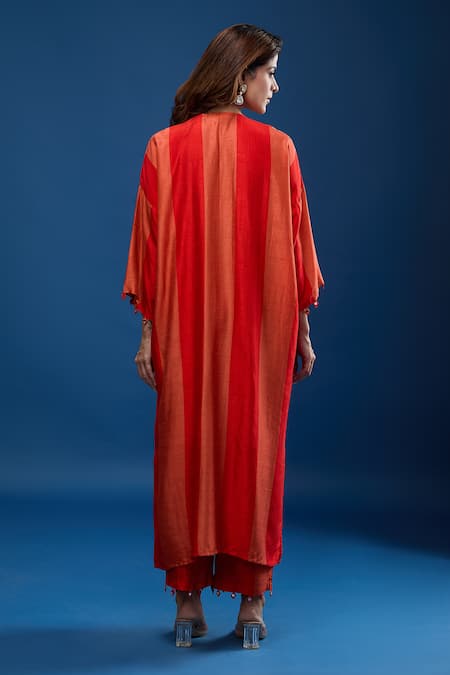 Rust red & beige striped kaftan featuring gold embroidery at the yoke. Paired with a matching pant with tassel detailing.