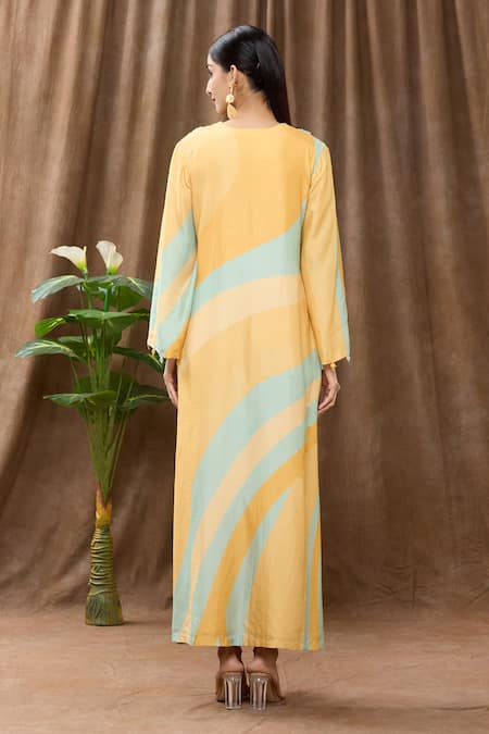 Yellow and green bamberg silk dress with an embroidered collar in sequins and fringe.