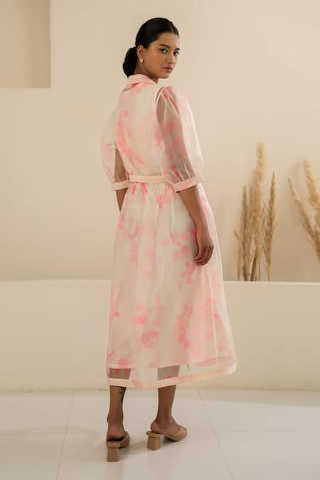 Pink Organza, Chanderi Collared Cherry Blossom Print Shirt Dress