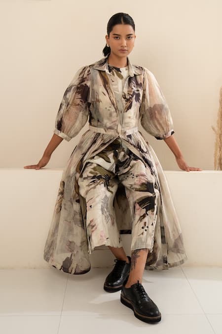 Grey Organza, Linen Embroidery Collared Floral Print Jacket With Jumpsuit