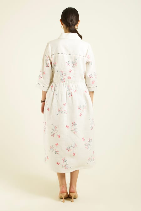 Ivory Linen Embroidery Collared Side Gathered Shirt Dress