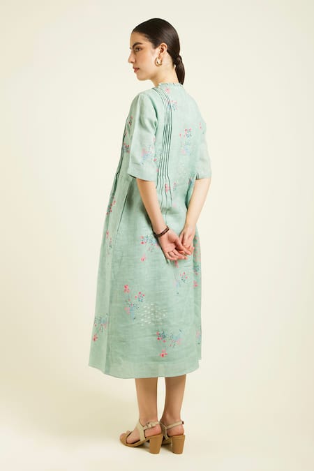Green Linen Embroidery Collared Mint Front Printed Midi Dress