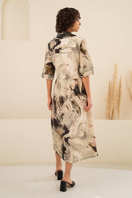 Grey Chanderi Embroidery Collared Floral Print Gathered Shirt Dress