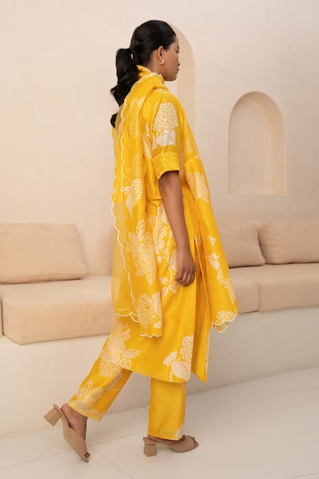 Yellow kurta featuring all over flower vine print with scallop trim. Paired with coordinating pant and dupatta.