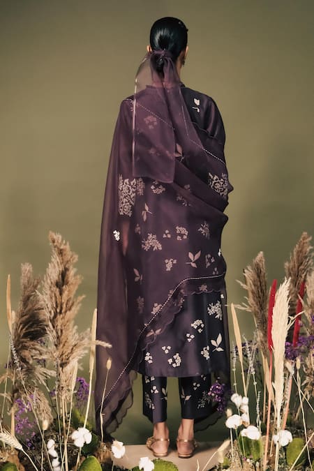 Purple kurta featuring machine embroidery and discharge printing. Paired with coordinating pant in silk Chanderi/Organza fabric.