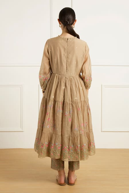 Beige gathered Anarkali in mul chanderi featuring machine embroidery and hand detailing. Paired with silk chanderi pants.