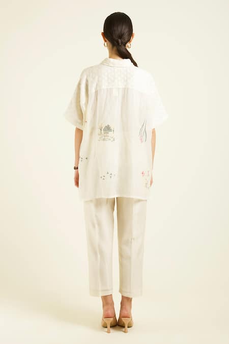Ivory kaftan shirt in mul chanderi featuring handblock printing. Paired with straight pants in silk chanderi.