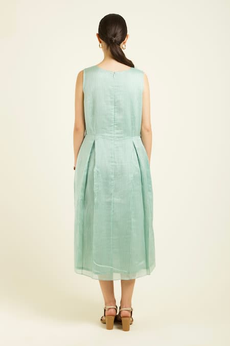 Mint Organza Embroidery Round Neck Printed Jacket And Stripe Dress