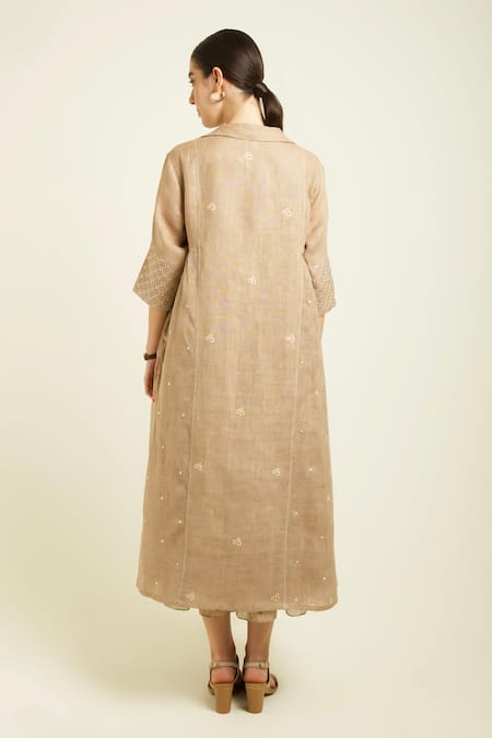 Beige gauze linen jacket with embroidery and a tiered dress in mul chanderi. The dress features handblock printing and delicate hand detailing.