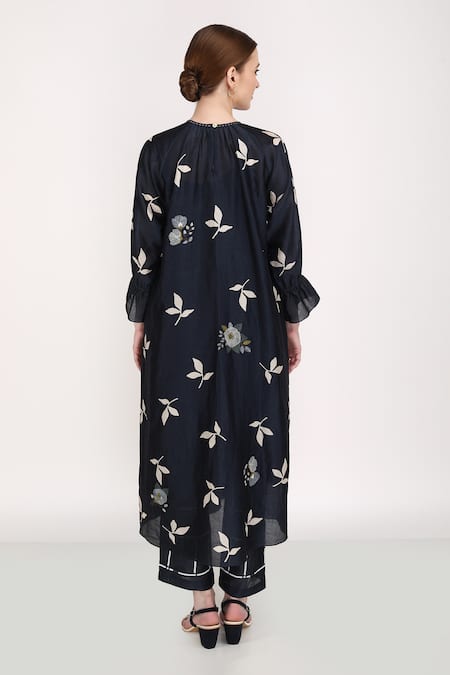 Indigo kurta with leaf print & frill sleeve hem. Paired with checkered pant & dupatta.