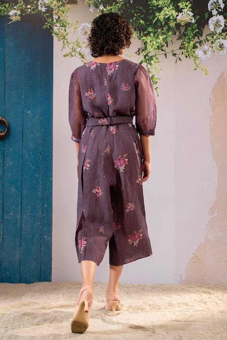 Purple jumpsuit crafted in linen featuring floral block print and puffed organza sleeves. Comes with a matching belt for a cinched waist.