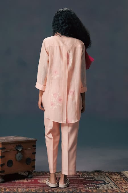 Old rose pink shirt in mul chanderi featuring machine embroidery. Paired with straight pants in silk chanderi.