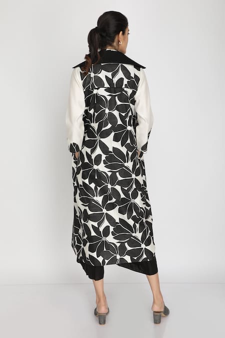Ivory organza jacket with contrast floral print, lapel collar & side pockets. Comes with black linen jumpsuit.