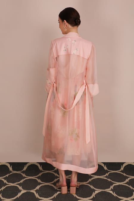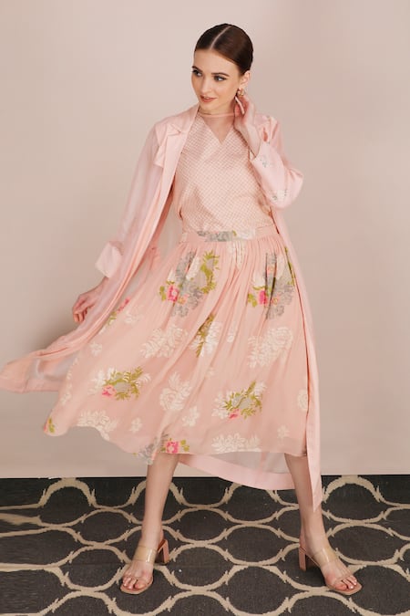 Buy_Arcvsh By Pallavi Singh_Peach Organza, Georgette, Linen, Cotton Voile Jacket Collar, Top And Skirt Set_Online_at_Aza_Fashions