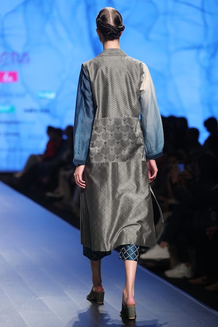 This ombre blue & white tunic that comes with a grey printed long jacket. It is teamed up with printed pant for a perfect ensemble look.