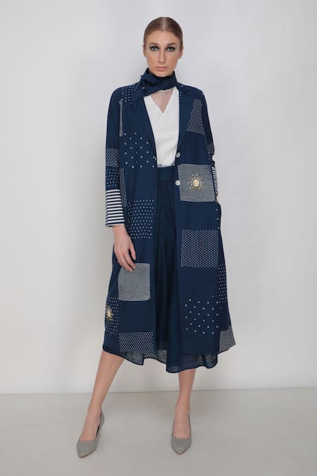 Indigo front-open jacket with polka dot, striped print & placement floral embroidered motifs.