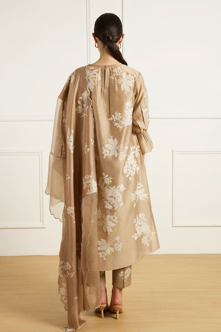 Beige discharge print tunic crafted from silk chanderi featuring dori embroidery. Paired with matching silk chanderi pants and a lightweight organza dupatta.