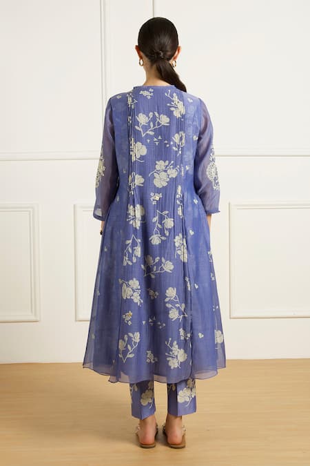 Blue Muslin, Silk Embroidery Round Twilight Pleated Tunic And Printed Pants Set