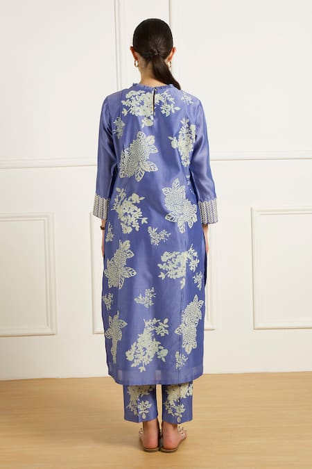 Twilight blue tunic featuring front pleats and machine embroidery details. Paired with printed pants and an organza dupatta.