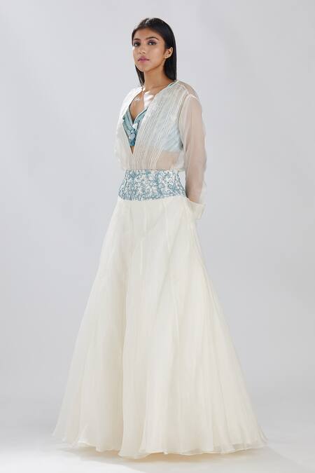 Ivory sheer top with ladder lace trims in front and a plunge V neck. Comes with aqua bustier hand embroidered with sequins, bugle beads, embroidered buttons and tassels and a pleated high waisted organza lehenga with embroidery on the waistband.